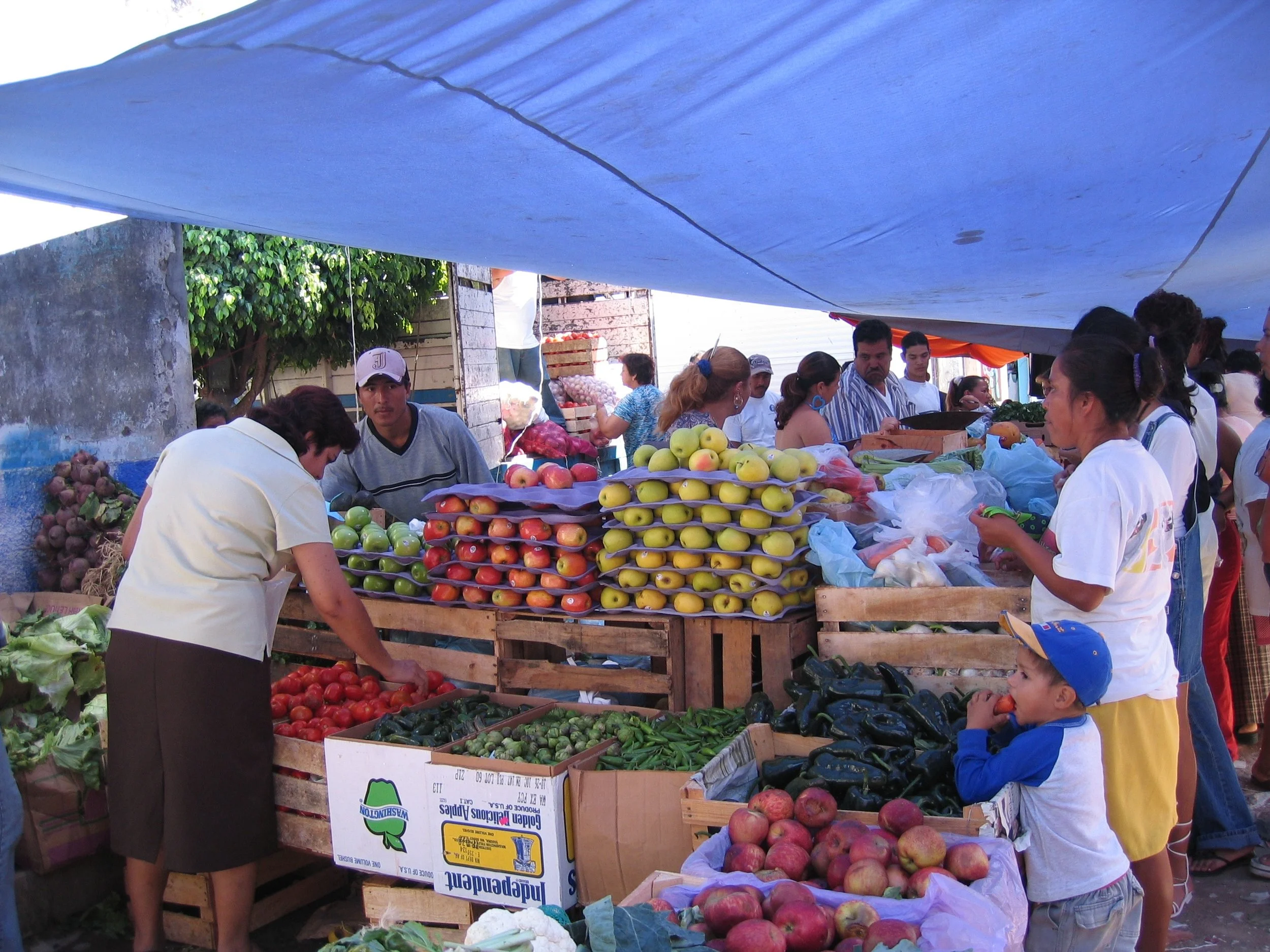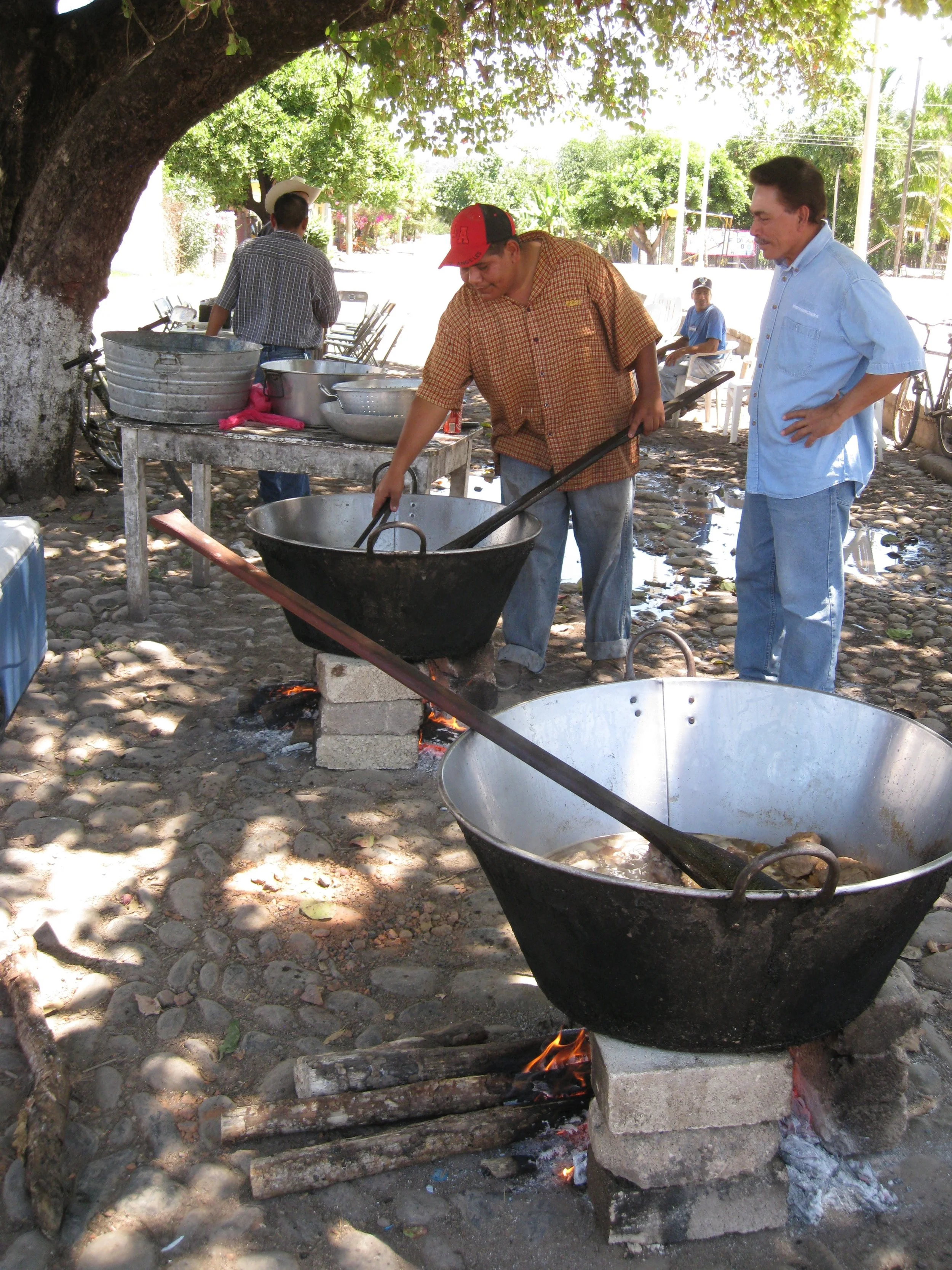 Wednesday is market day in Zacualpan. It’s a street market, running along the north side of the soccer field. Here you’ll find many basic necessities except meat and poultry: clothing, kitchen implements, tools, replacement burners for your gas stove, fresh fruit and vegetables, herbal medicines for every ailment as well as pirated CD’s. There are a few little restaurants set up in the street, and at the entrance is a chicharrón concession: pork cracklings cooked in a huge tub of boiling oil over a wood fire.