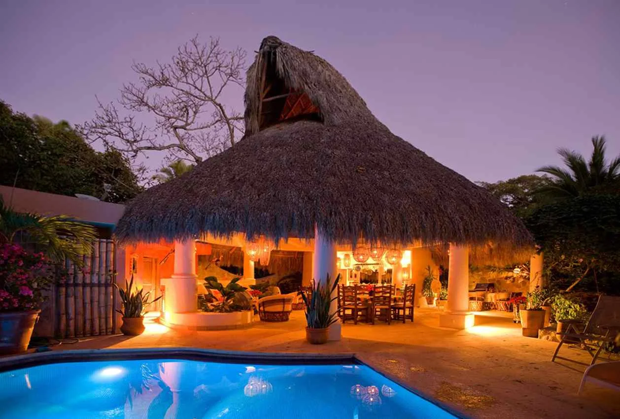 Casa Colibri’s casa grande is an open structure. All other rooms are walled, but two of the bedrooms are palapa structures with conical, palm-frond roofs and large, open vents at the peaks. There is an up-to-date kitchen with six-burner gas range, large double sink, refrigerator, toaster, blender, coffeemaker, microwave and full set of pots and pans, glassware, silverware, kitchen knives and linen napkins.
